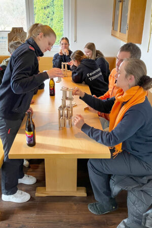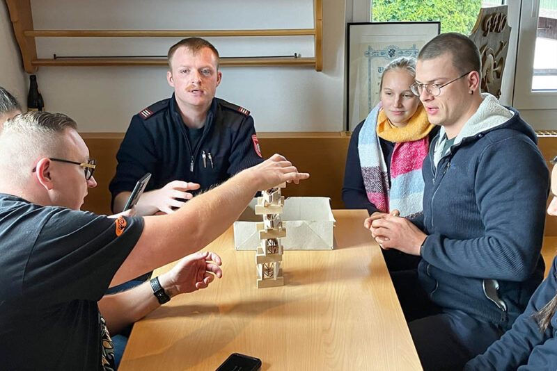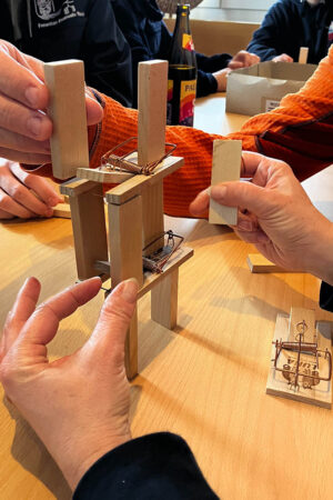 Die Teilnehmer bei der Lösungsfindung und beim Bau des Mausefallen-Jenga-Turms.