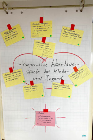 Leider muss bei so einer Verstanstaltung auch etwas Theorie sein: Die Themen Erlebnispädagogik und die Einarbeitung in kooperative Abenteuerspiele wurden aber immer wieder unterbrochen durch – auch für die Erwachsenen – unterhaltsame und lustige Spiele.